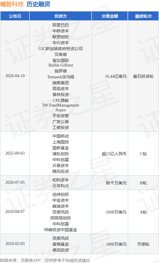 证券之星消息,根据天眼查APP于4月19日公布的信息整理,上海曦智科技股份有限公司基石投资轮融资,融资额16.44亿港元,参与投资的机构包括阿里巴巴,中移资本,联想创投,中兴资本,GIC新加坡政府投资公司,贝莱德,富达国际,Baillie Gifford,施罗德,Temasek淡马锡,瑞银集团,高瓴资本,景林投资,CPE源峰,3W FundManagement,Aspex,平安资管,广发公募,工银投资,投后估值约160亿港元。