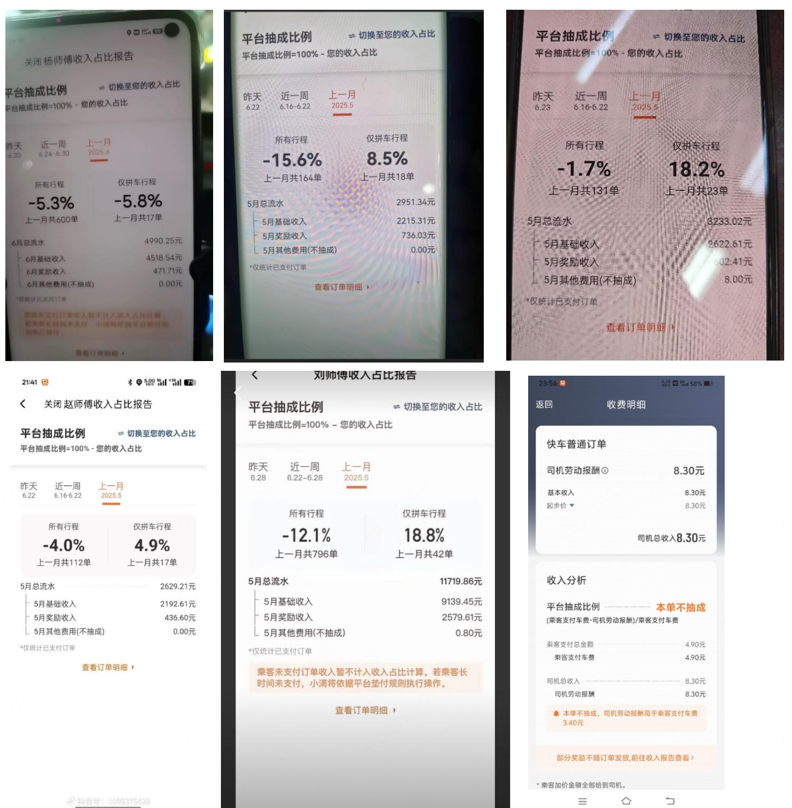 报告收集的部分滴滴司机负抽成图片。当供需失衡,平台需要发放大额优惠券吸引乘客,或补贴奖励司机出车时,都会出现低抽成或负抽成订单。